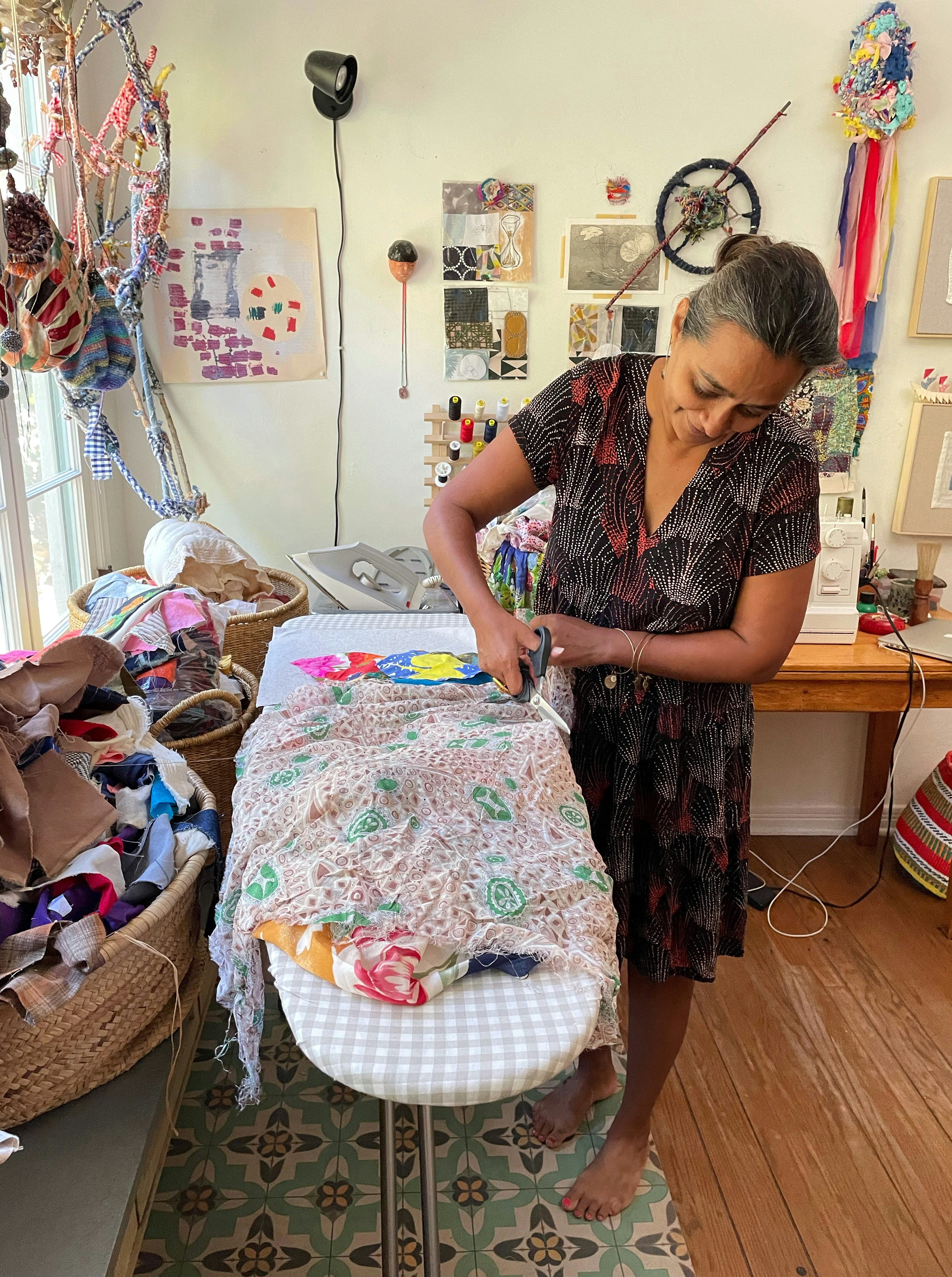 For her, the concept of layers and transparency are symbolic of our being – she loves that she can find these qualities inherent in textile scraps. She believes we collect experiences throughout our lives. These experiences mold and change us; they sway our character. When all is said and done we remain the same person, however changed we may seem. Our integrity, our soul, our being that was birthed into this lifetime remains unchanged. Through stitching layers upon layers, she creates unity and celebrates life.