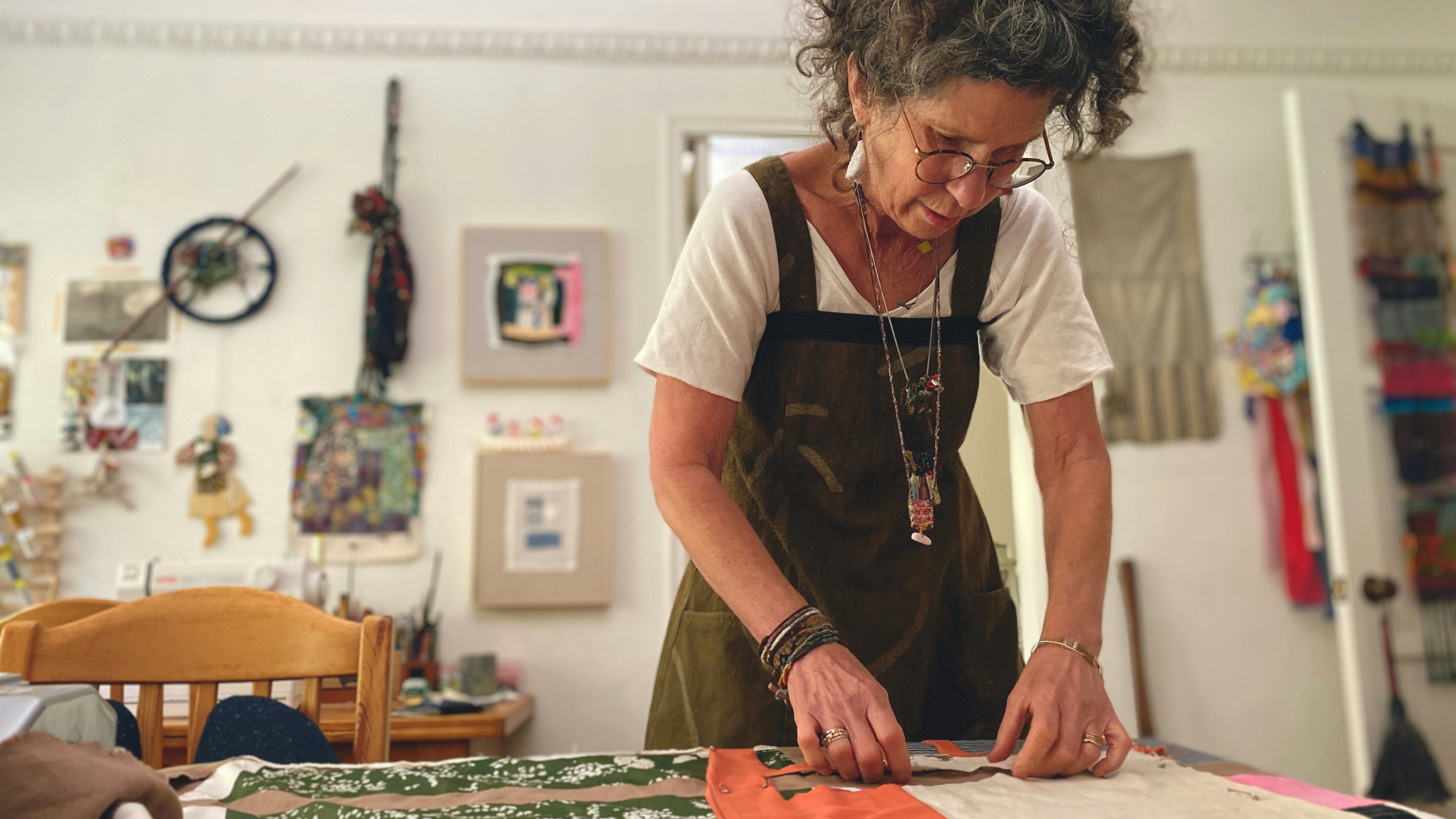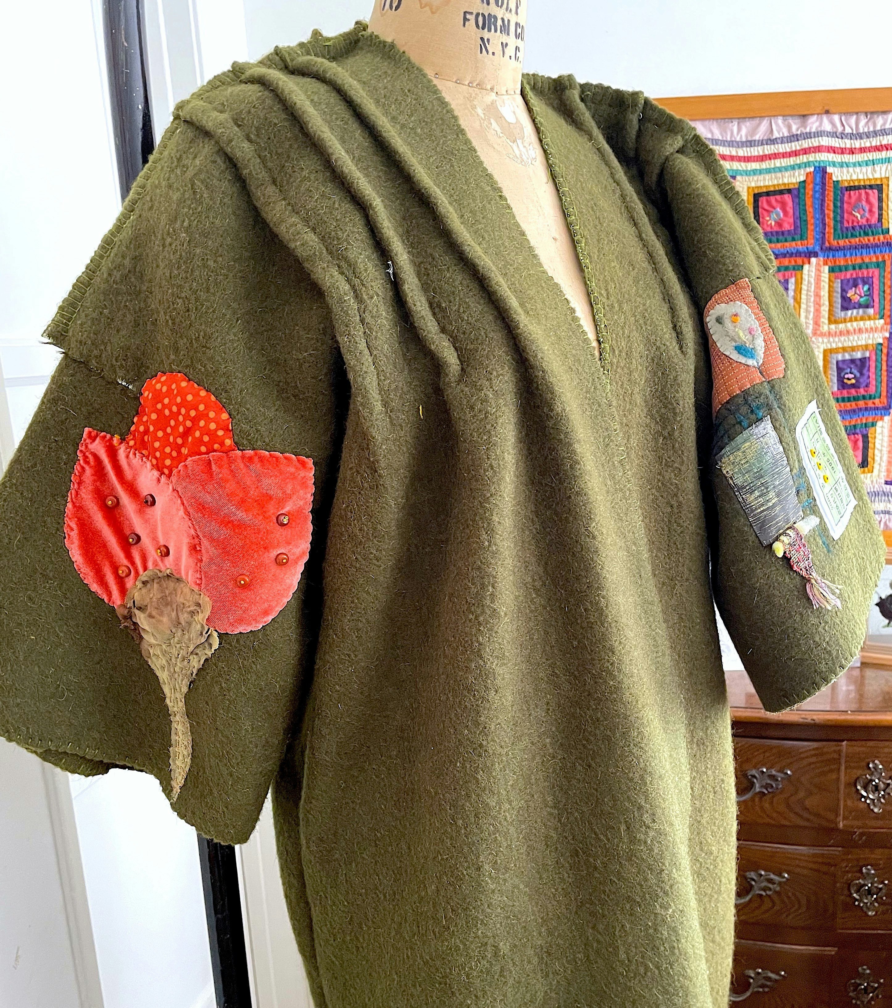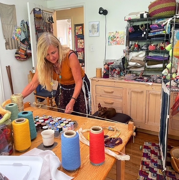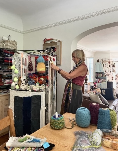 Inspired by the beauty of nature, she favors organic shapes, colors and textures in both her functional garments and fiber structures. Throughout her practice, she gently manipulates fabric through stitching, knotting, appliqué and layering. Time slows as she works intuitively letting the materials guide, observing and finding peace.