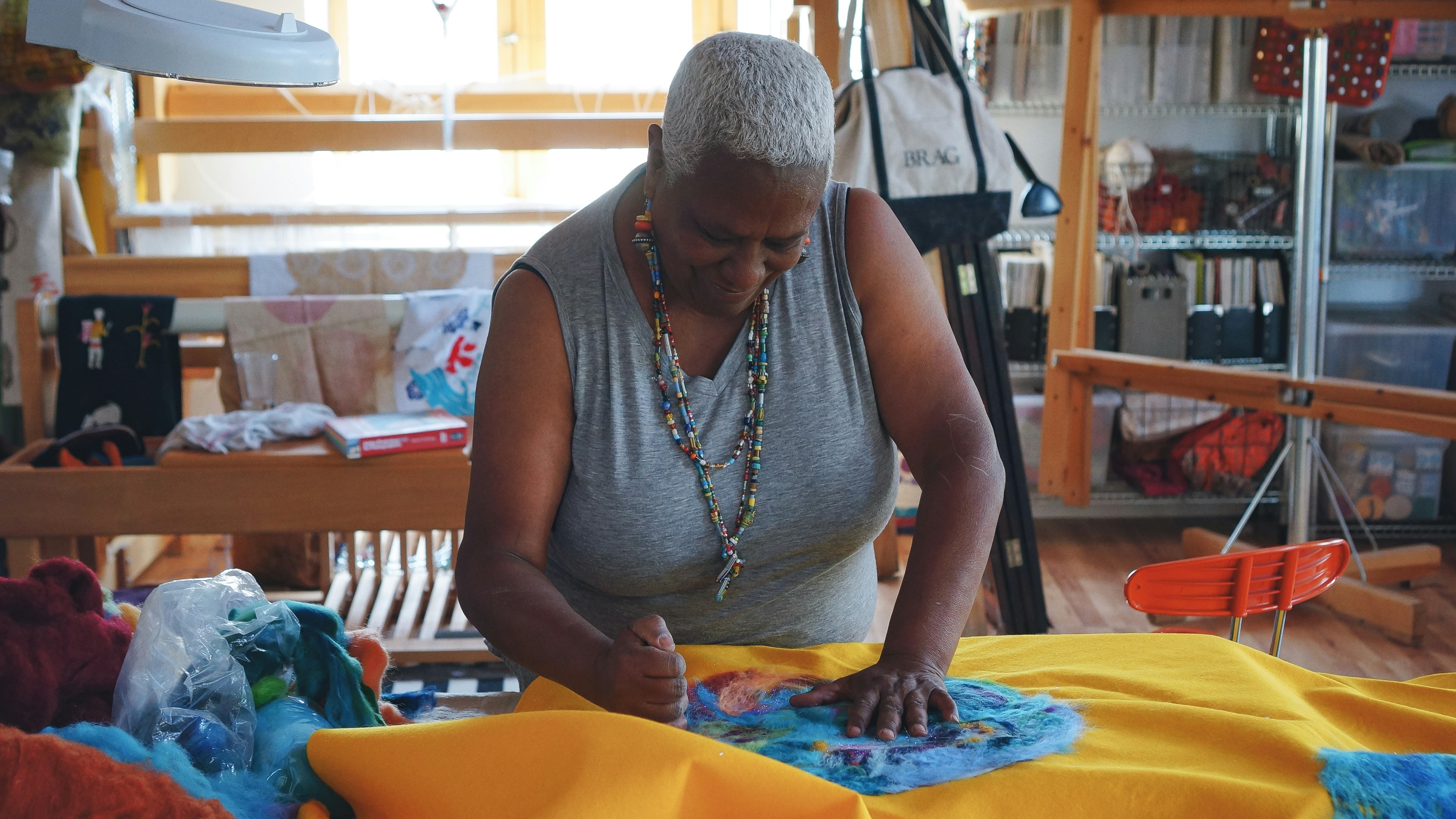 Karen’s main interest is to create a culturally inclusive textile vocabulary. Her textile practice includes everything from raising animals and processing their fleece to natural dyeing, weaving, embroidery, printmaking, felting, printing, and photo transfer. She merges handwoven textiles, digital prints, embroidery, and hand-dyed fabrics to tell the stories of African American lives and her ancestral heritage.
