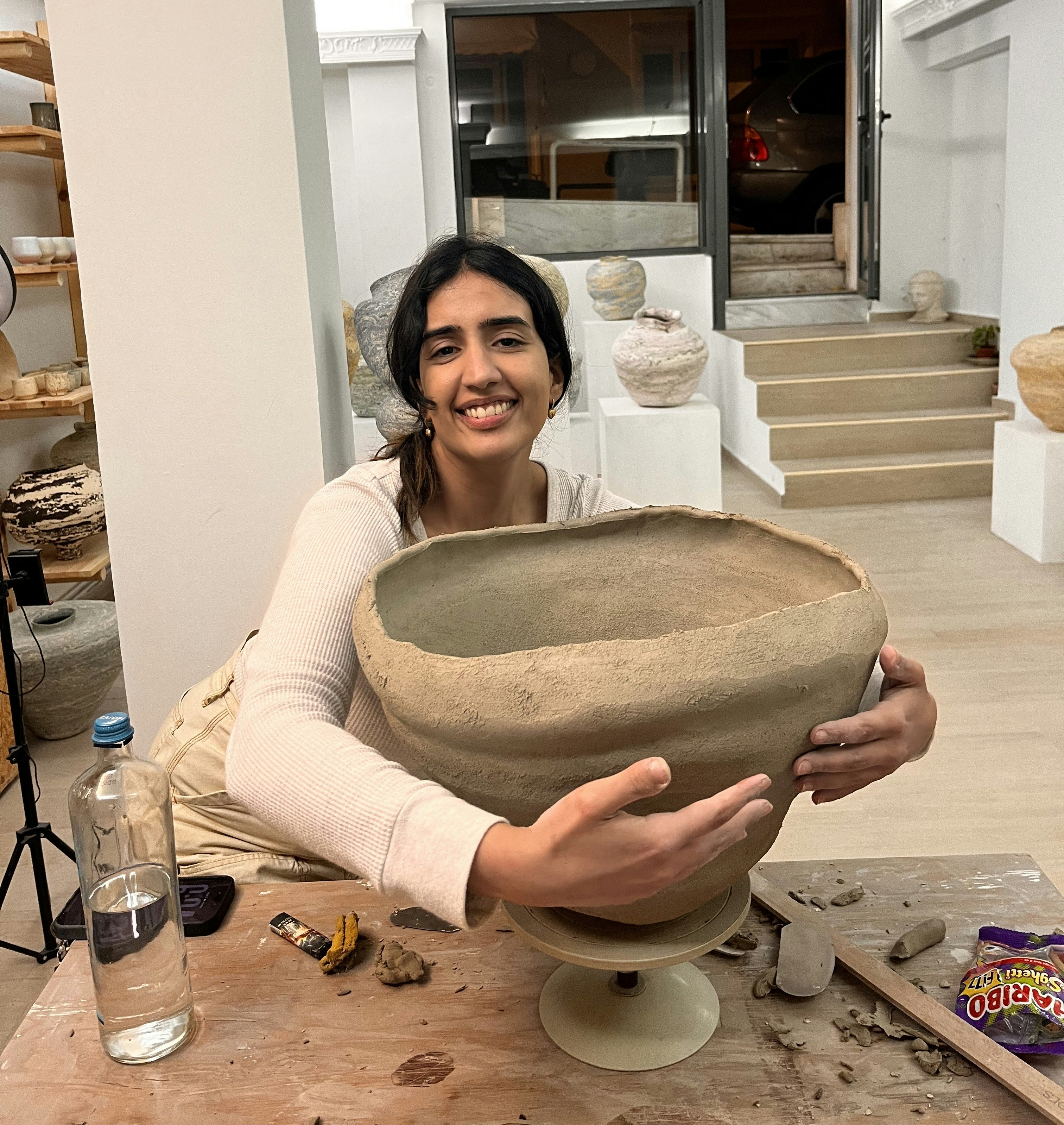 Maria is a hand-building ceramic artist whose work fuses ancient traditions with playful forms and contemporary surface techniques. Drawing inspiration from ancient Greek pottery and votive traditions, she blends historical motifs with a touch of whimsy. “Immersing myself in Greek culture, living in the very heart of Athens, has profoundly shaped my work,” she says.