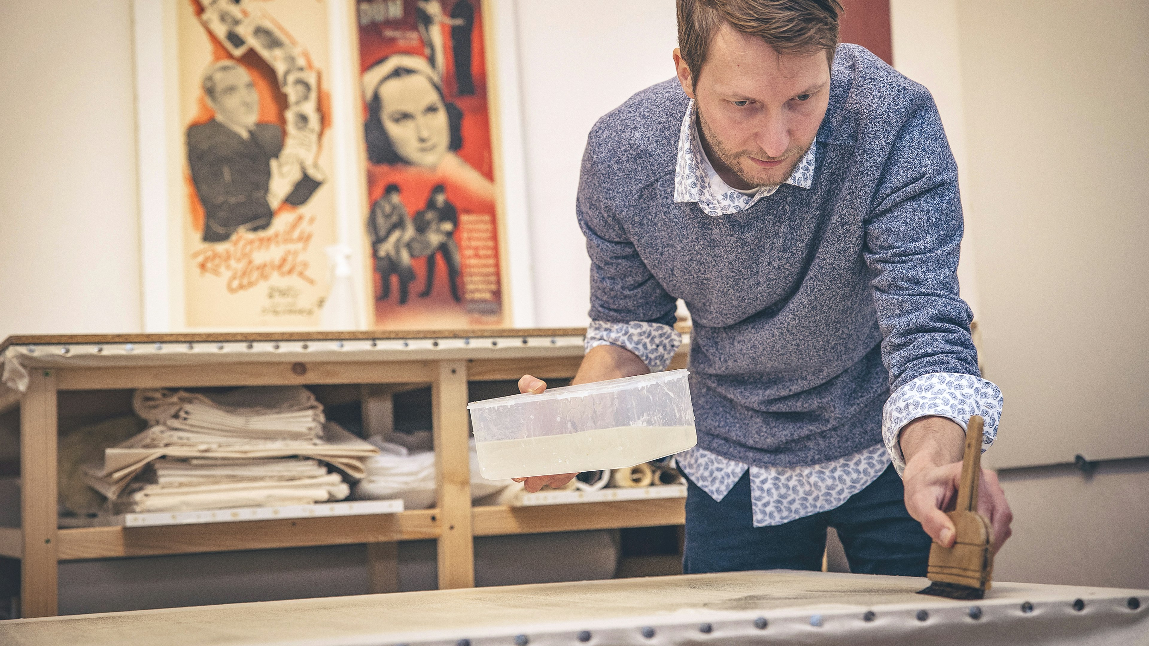 Ondrej's passion for graphic design, typography, music, and film led him to specialize in poster restoration and artwork on paper. He founded his private restoration practice, specializing in restoring posters, banknotes, maps, drawings, prints, and comic books. His main techniques for poster restoration are linen and Japanese paper backing, and he is also skilled in retouching and paper loss compensation.