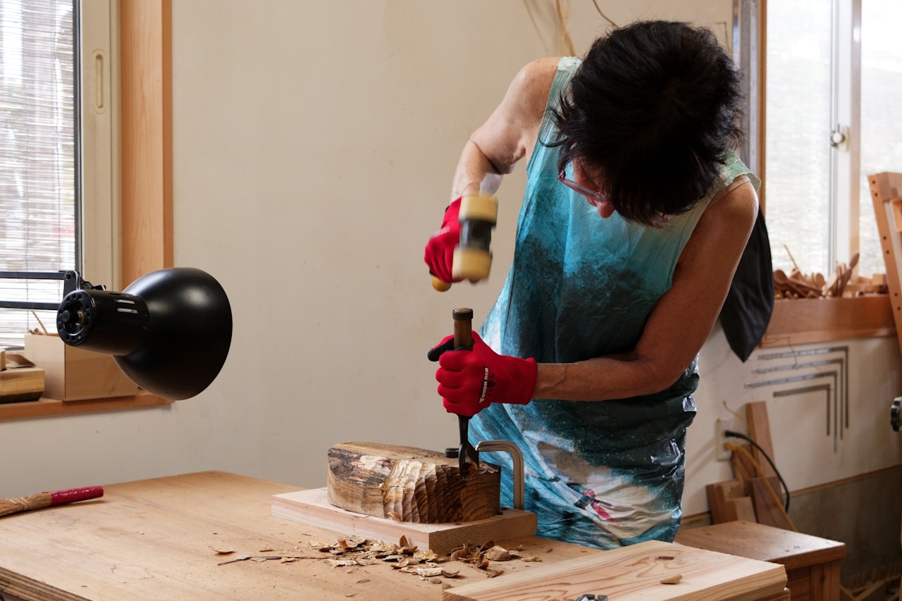 The 3 days I spent learning wood carving with Takashi were amazing and extremely memorable. Not only is Takashi a wood carving master (seriously), he was a wonderful teacher in every way explaining carving techniques, tools and how to work with the wood. He’s also a lovely person to be with. He helped me execute the design of my fruit bowl from start - splitting the log! - to finish - carving my name, date, and the Japanese characters for Japan - on the bottom. I had no idea how physical carving a bowl would be (very!), but our conversations about life, science, and general joking around made the time fly by, as did his enthusiasm and encouragement for my every effort.