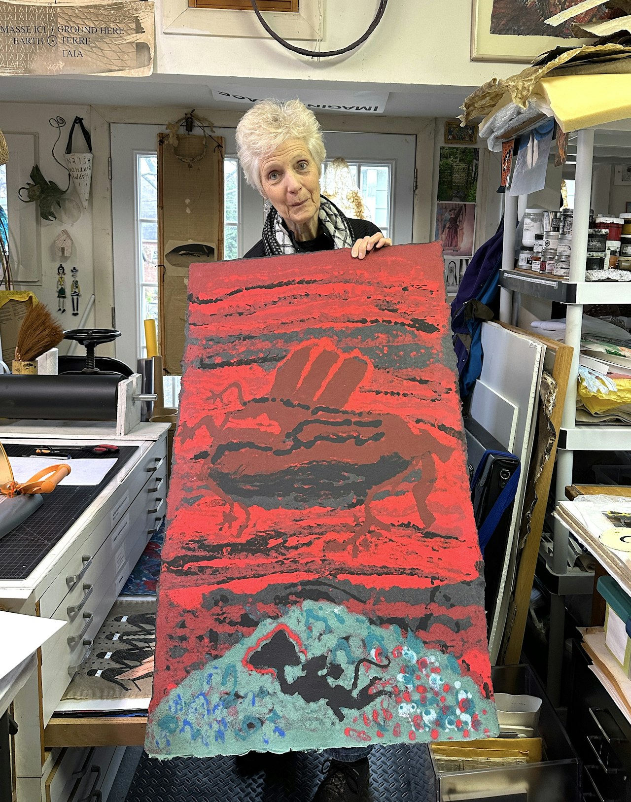 Papermaking and what I now know as paper pulp painting had interested me for a while. I was curious how and if my own use of color and dye on fabric would translate to this tactile medium. I loved what I saw in Helen’s work—particularly her use of color to divide and layer the paper’s surface area. I wanted to see how that happened in her studio.